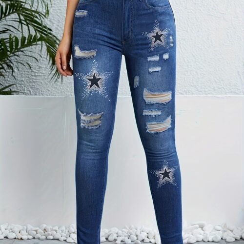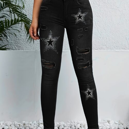 Star Print Jeans deliver a high-energy, alternative aesthetic featuring bold, glittery star motifs and heavy destruction for a standout look. These black ripped skinny jeans are designed with a form-fitting silhouette that hugs your curves while offering edgy shredded details along the legs. Perfectly capturing the Y2K distressed denim pants trend, they feature a flattering high-rise waist and a washed-out charcoal finish. These high waisted goth trousers are crafted from a premium blend, functioning as stretchy patterned skinny jeans that provide both all-day comfort and a sharp, rebellious style.