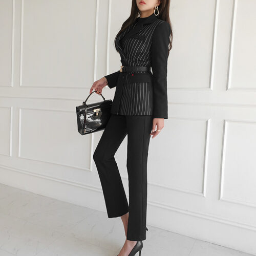 Striped Blazer Set elegance defines this modern black ensemble, featuring a unique asymmetrical pinstripe panel that adds a contemporary edge to classic tailoring. This pinstripe two piece suit is designed with a high-fashion aesthetic, perfectly paired with an asymmetrical slim pants set for a statuesque, professional silhouette. As a complete belted office lady outfit, it includes a sleek waist cincher to enhance your frame. The double breasted tailored jacket is finished with ornate gold buttons, making it a sophisticated choice for executive meetings or chic social events.