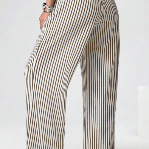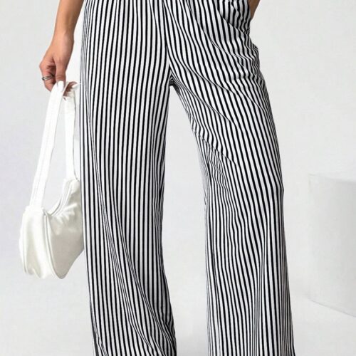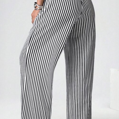 Striped Trousers serve as the cornerstone of a versatile wardrobe, offering a sharp, monochrome aesthetic that transitions seamlessly from day to night. These Vertical Striped Trousers feature a classic pattern designed to elongate the silhouette while providing a sophisticated, drapey fit. As High Waisted Wide Leg Pants, they offer a comfortable and secure waistband that flatters every figure with a modern, airy feel. Whether utilized as Professional Work Pants Women trust for corporate settings or as Smart Casual Office Trousers, this pair ensures a polished look with effortless ease.