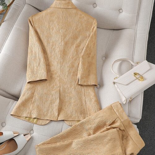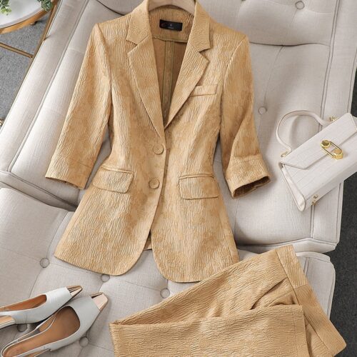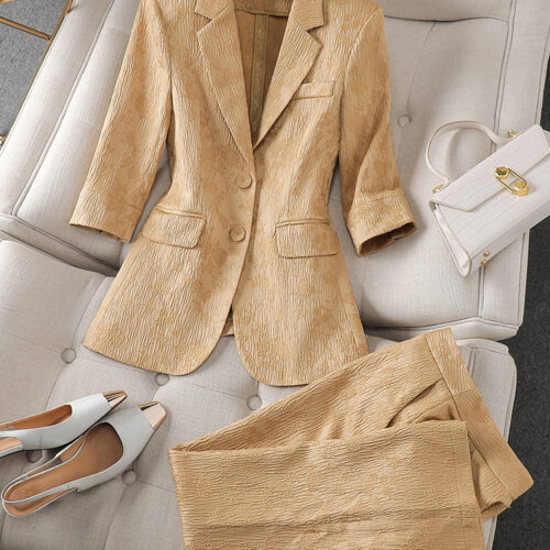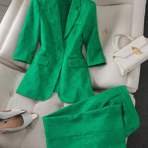 Two Piece Blazer Set elegance defines this vibrant emerald ensemble, meticulously crafted with a unique crinkle texture for a modern edge. This stunning green textured suit features a tailored half sleeve jacket outfit that provides a fresh, breathable alternative to traditional office wear. Perfect for summer business attire, the structured blazer with notched lapels pairs seamlessly with the matching straight leg trouser suit bottoms to create a statuesque and polished silhouette. Whether for a high-stakes meeting or a chic social event, this set ensures you remain sophisticated and comfortable.