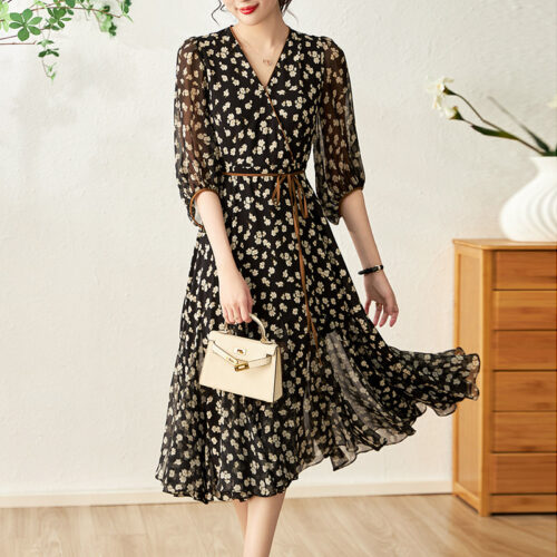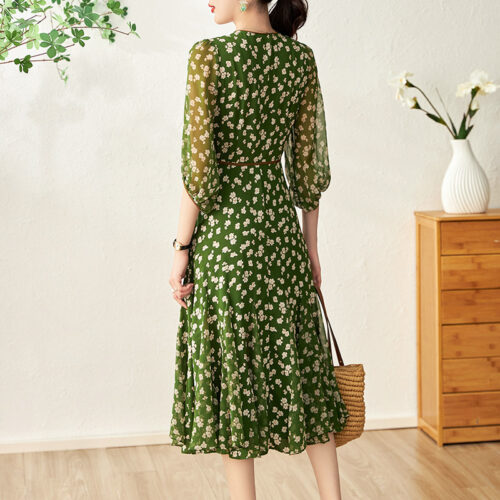 V Neck Floral Dress elegance defines this timeless silhouette, inspired by effortless French style wrap dress aesthetics. Crafted from a lightweight green chiffon midi dress fabric, it features a delicate daisy print that perfectly embodies the long sleeve summer tea dress look. The contrasting tie-waist detail cinches the figure, creating a flattering A-line shape that doubles as a boho chic printed sundress. Whether for a garden party or a casual brunch, this airy and breathable piece offers a sophisticated touch of romance to any modern wardrobe.