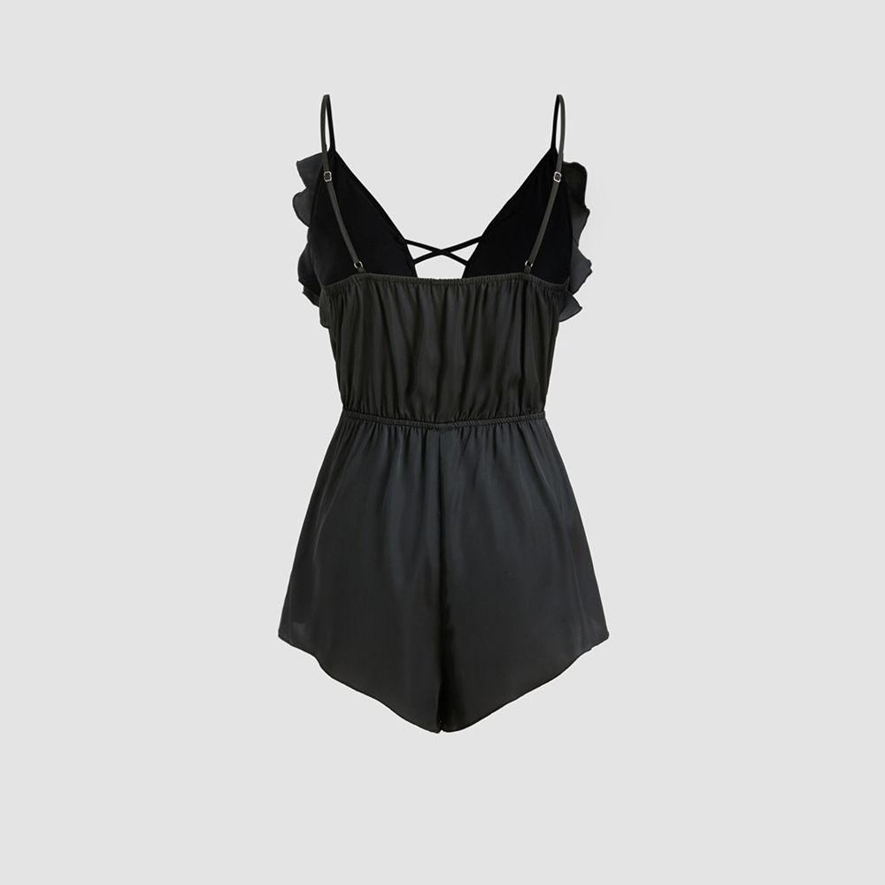 V-Neck Romper elegance meets romantic summer charm in this essential all-in-one wardrobe piece for the modern woman. This Ruffle Camisole Jumpsuit features a signature plunging neckline and delicate flutter trims that create a timeless silhouette, making it a standout Sexy Homewear One-Piece for lounging or seaside strolls. Designed as the ultimate Summer Ruffled Playsuit, it offers a breezy and flattering fit that captures the ease of a Comfortable V-Neck Bodysuit. Crafted from soft, breathable fabric, this jumpsuit ensures a luxurious feel that moves beautifully throughout your sun-drenched social events.
