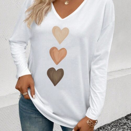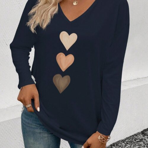 V Neck Top styling combines effortless comfort with a modern graphic touch in this everyday essential. This Heart Print Long Sleeve piece is designed to be your go-to Casual V Neck Shirt, offering a relaxed silhouette that flatters every figure. As a premium Black Graphic Blouse, it features a unique triple-heart motif that adds a playful yet sophisticated element to the classic design. Whether you are running errands or meeting friends, this Comfortable Heart Tee provides a soft, breathable fit that pairs perfectly with denim.