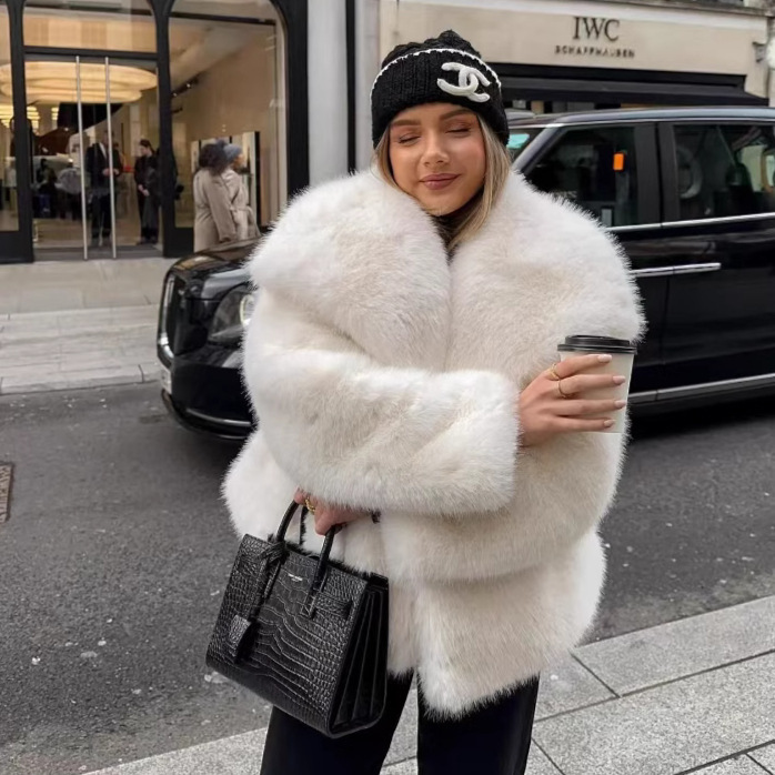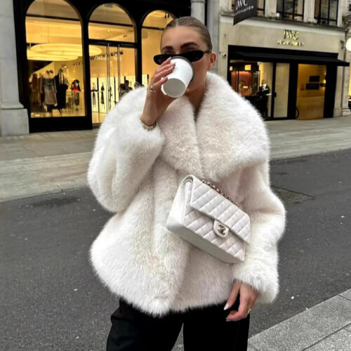 White Fur Jacket: Redefine winter elegance with this stunningly voluminous short plush coat in a pristine snowy white. Expertly crafted with ultra-soft, “fried street” style synthetic fibers, this piece features a dramatic large lapel that perfectly captures the bold “Mob Wife” aesthetic trending across European fashion capitals. The fluffy, oversized silhouette provides unparalleled warmth while remaining effortlessly all-matching—whether styled over a sleek evening dress or paired with vintage denim for a high-fashion street-shot look. Combining cozy comfort with iconic internet-celebrity glamour, this white faux fur jacket is the ultimate statement piece for the 2026 season.