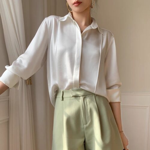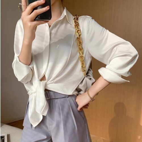 White Satin Shirt Women is a timeless wardrobe essential designed for effortless elegance in the 2026 season. This Elegant Silk Blouse White features a soft, luminous sheen that provides a sophisticated look for both day and evening wear. Crafted as a high-end Triacetate Satin Work Top, the fabric offers exceptional comfort and a wrinkle-resistant finish, making it ideal for the professional modern woman. As a versatile Ladies Formal Button Up Blouse, it pairs beautifully with tailored trousers or skirts. This Luxurious Glossy White Shirt captures the true spirit of French chic, ensuring you radiate confidence on every occasion.Heavy Industry Pearl Rhinestone Stretch Side Seam Tassel Short Dress
