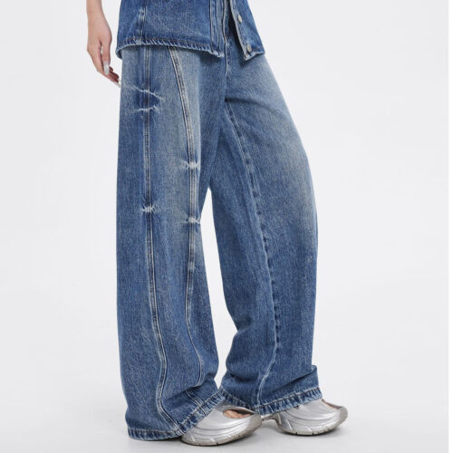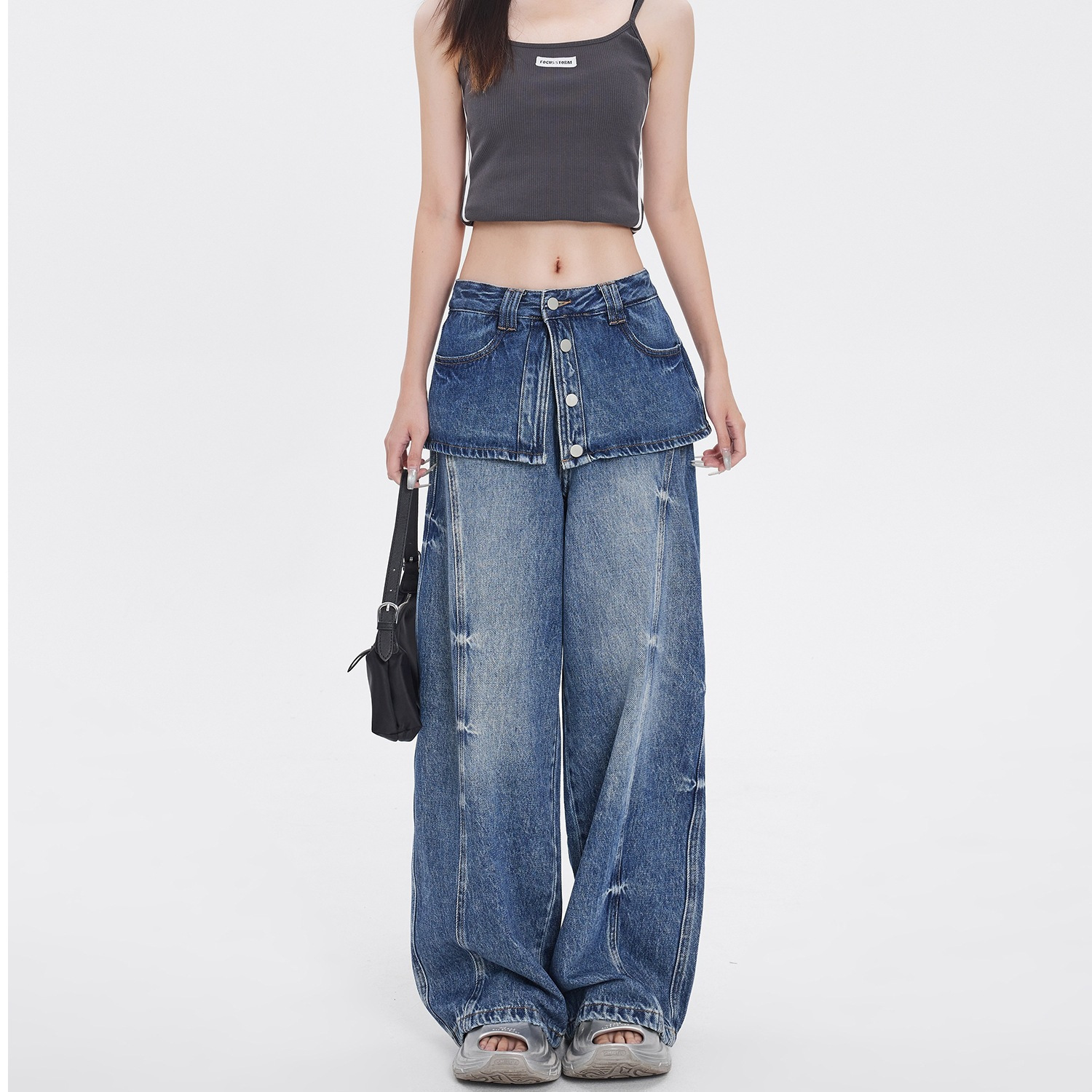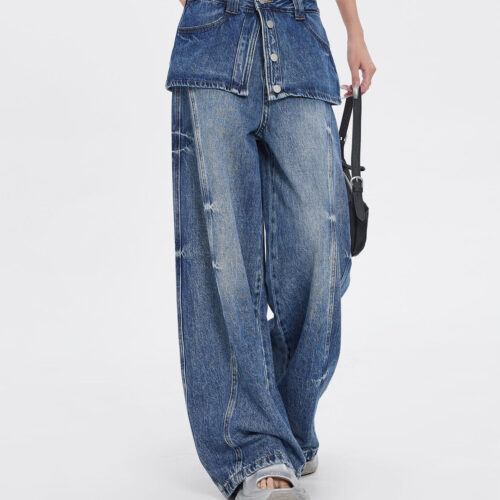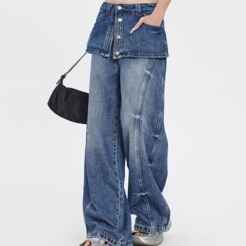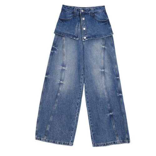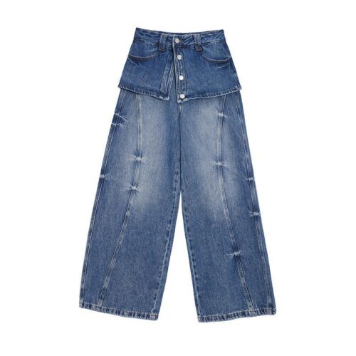 Wide Leg Denim Jeans get a bold high-street transformation with this innovative Faux Two-Piece Jeans design that mimics a layered skirt-over-trousers look. These Distressed Baggy Denim bottoms feature a vintage wash and structured paneling to create a voluminous, floor-skimming silhouette. As a standout piece of Retro Streetwear Jeans, they blend early-2000s nostalgia with modern architectural tailoring for a truly unique aesthetic. Whether styled for a concert or a city stroll, these High Waisted Skirt Jeans provide an edgy, layered vibe without the bulk, ensuring maximum style and comfort.