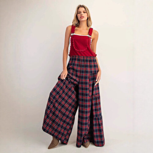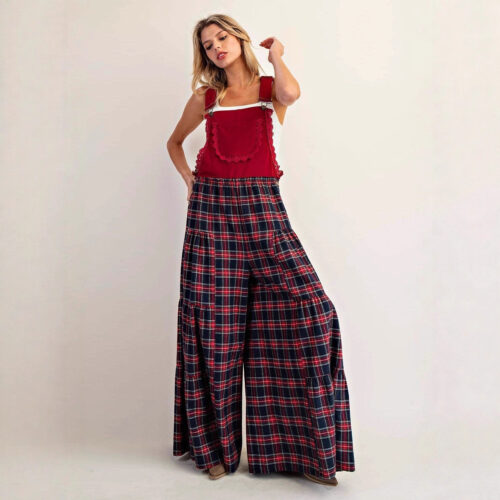 Wide Leg Jumpsuit elegance meets vintage-inspired charm in this unique multi-tiered silhouette designed for ultimate comfort. These plaid overalls feature a deep forest green bib paired with a striking red checkered pattern, offering a sophisticated take on wide leg tartan dungarees. Crafted as a loose fit checkered jumpsuit, the design includes a supportive elasticated waist and a voluminous cut that mimics high waisted plaid trousers. This statement piece provides a flattering, slimming fit that transitions perfectly from creative workspaces to casual weekend outings.