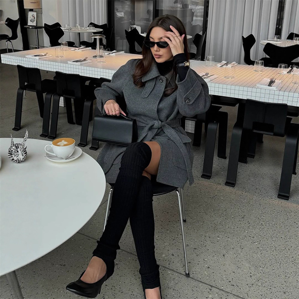 Wool Blend Coat: Master the art of sophisticated winter dressing with this premium charcoal grey short jacket, meticulously designed to blend timeless tailoring with modern European edge. This Wool Blend Coat features a high-quality, dense weave that provides exceptional warmth and a structured silhouette. The design is elevated by an elegant pointed lapel collar, functional oversized front pockets, and a matching lace-up tie belt that cinches the waist for a refined, feminine fit. Whether layered over a professional office ensemble or paired with a mini skirt for a chic city look, this versatile trench-style jacket is the ultimate statement piece for your 2025 seasonal wardrobe.